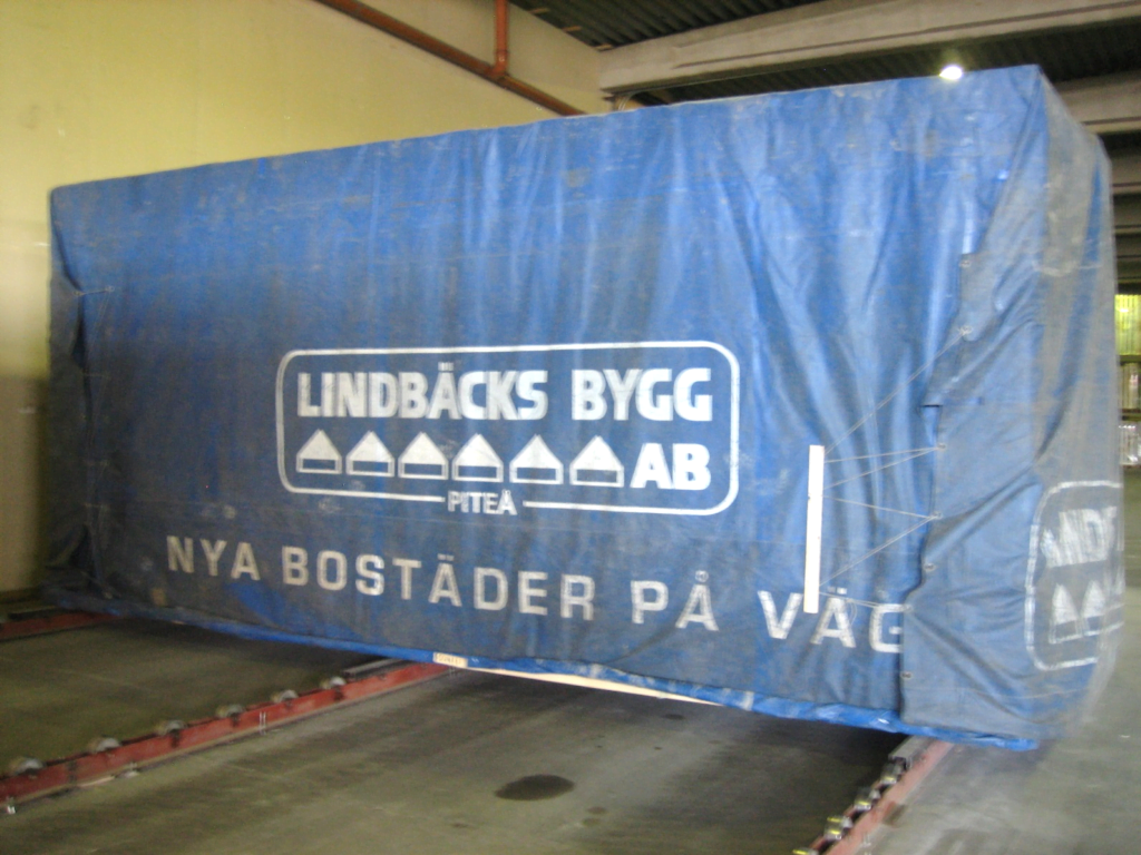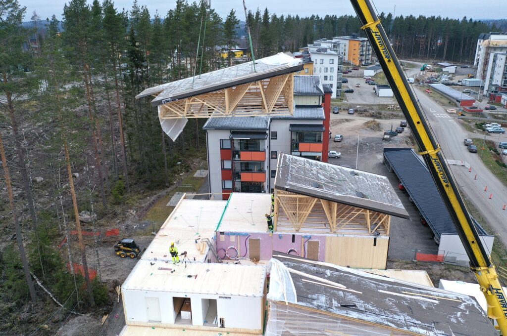 Kuva 14. Rakennuksen lopullisista kattolohkoista koostuva suojakatto tilaelementtitalon päällä (kuva: M2-Kodit Oy).