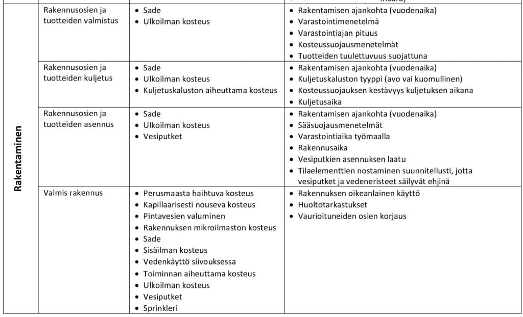 Rakennuksen kosteudenhallinta on kokonaisuus, joka koostuu kosteusteknisesti turvallisista suunnitteluratkaisuista, rakennusaikaisesta kosteussuojauksesta, rakenteiden hallitusta kuivattamisesta sekä rakennuksen oikeanlaisesta käytöstä ja huollosta. Taulukossa 1 on esitetty seikkoja, joihin tulee kiinnittää huomiota jo varhaisessa vaiheessa.