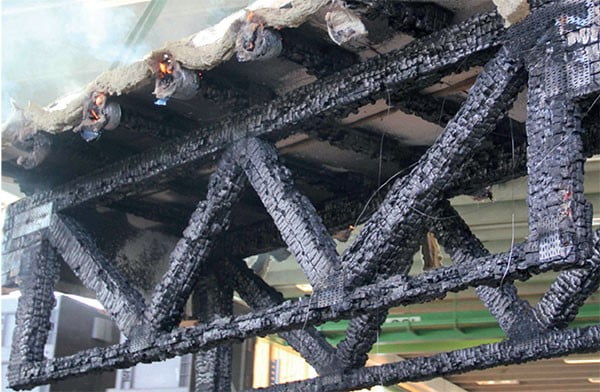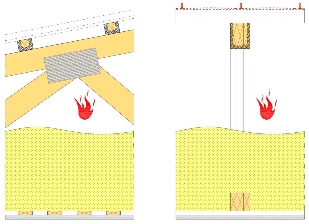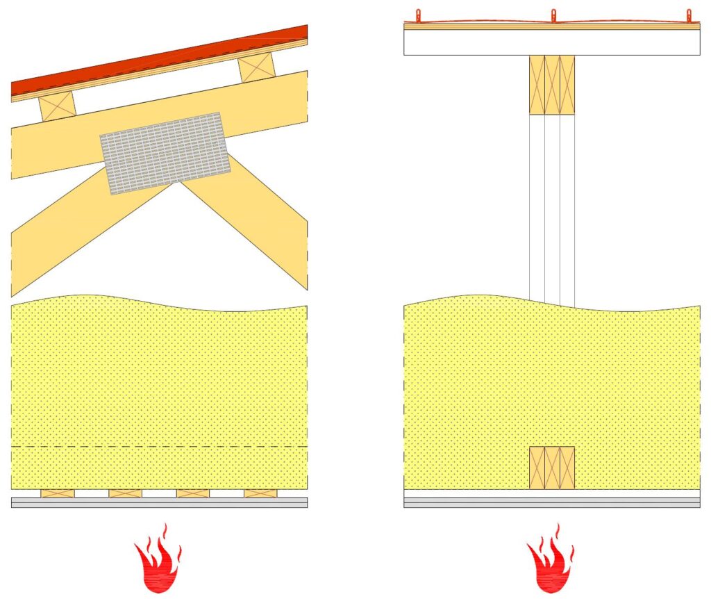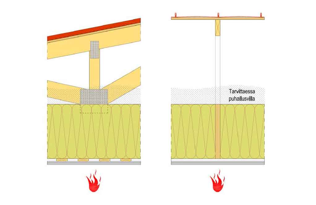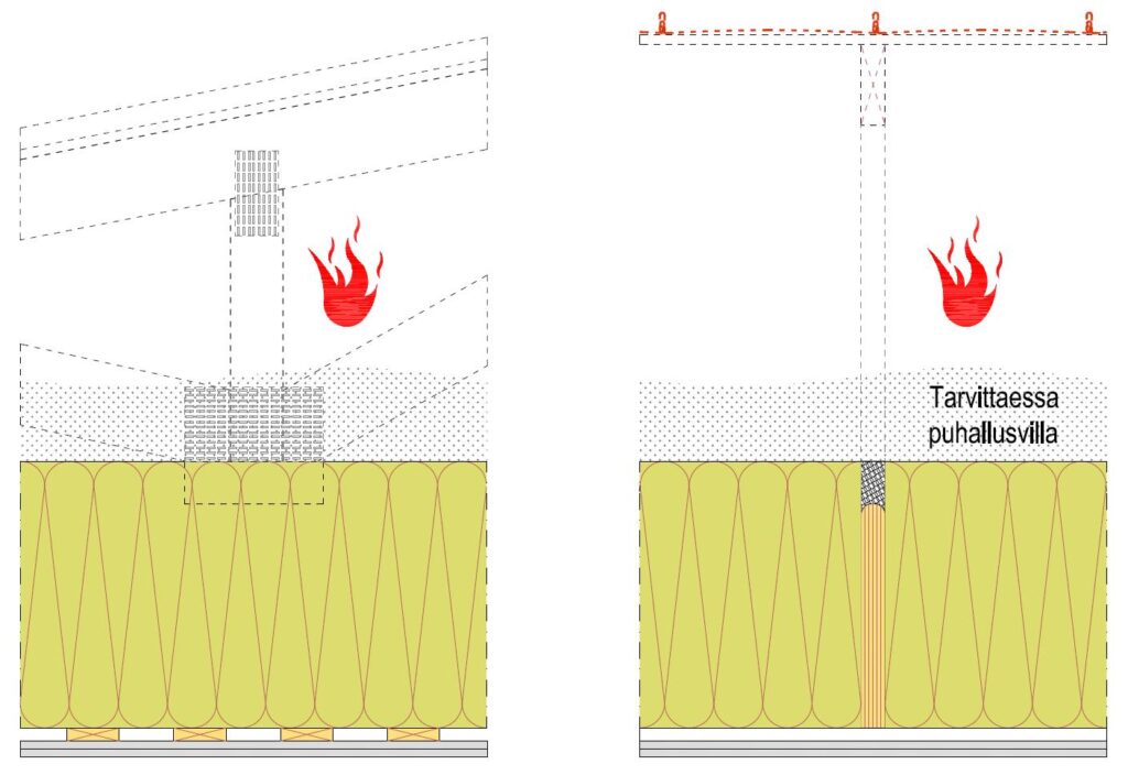 Kuva 8. Lämmöneristeitä ei tarvitse käyttää paloristikoiden yhteydessä ristikoiden palosuojaukseen.