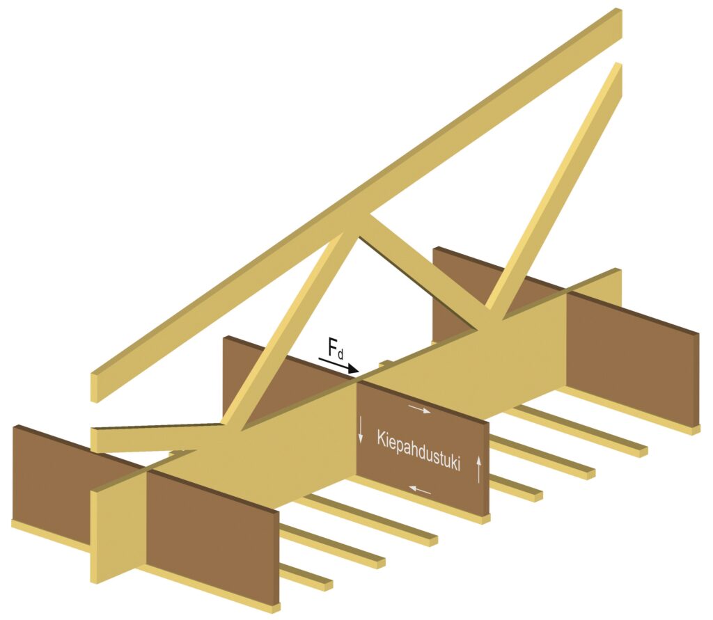 Suositeltava tapa kiepahdustuennan toteuttamiseen on alapaarteiden väliin asennettavat levymäiset jäykisteet. Kyseiset jäykisteet on suositeltavaa valmistaa samasta materiaalista kuin alapaarre. Tällöin kiepahdustuentaan käytettävät rakenneosat ovat samassa tasossa alapaarteiden kanssa ja hiiltyvät vain yläpinnastaan alapaarteiden tapaan. Lisäksi kiepahdustukeen syntyvä vaakavoima Fd saadaan siirrettyä luotettavasti alakattolevytykselle (kuva 6). Kiepahdustuet kiinnitetään alapaarteisiin ja alakaton koolaukseen voimasta Fd aiheutuville liitosvoimille.