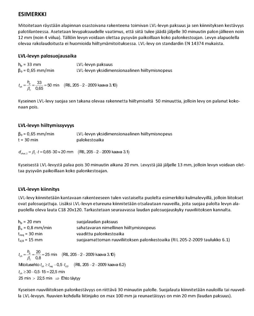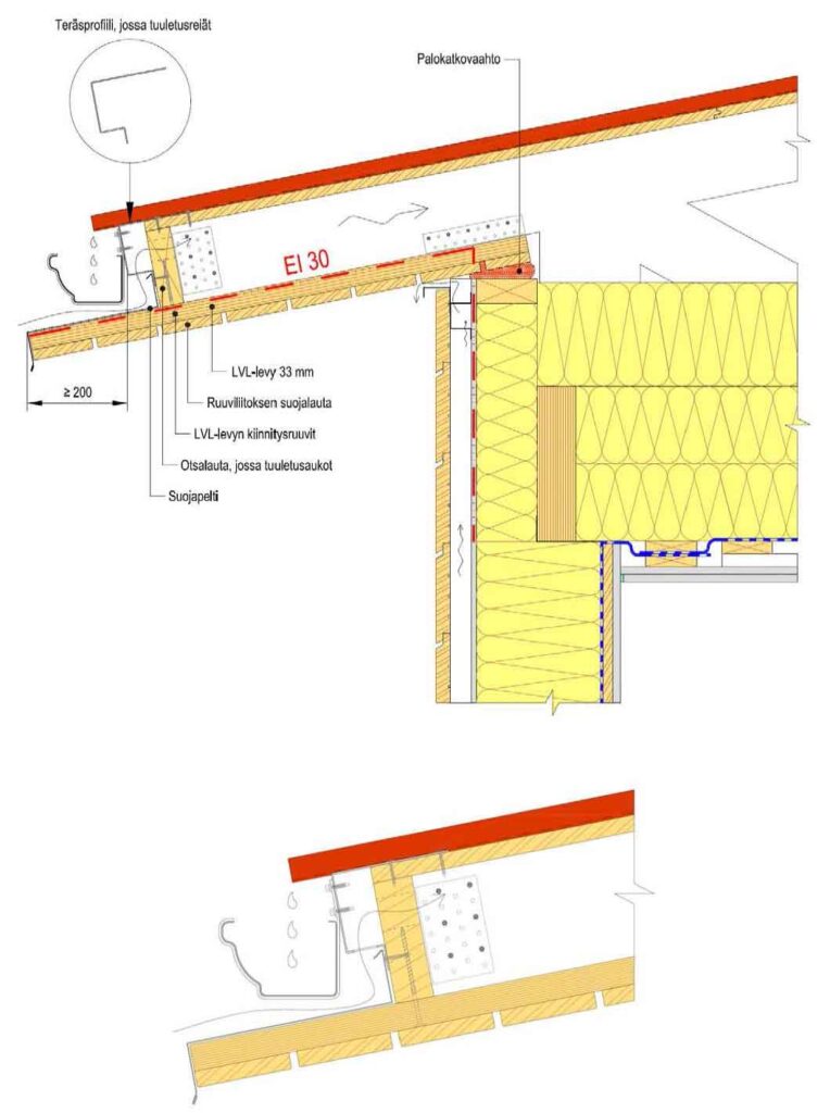 Kuvan 2 periaatteella toimiva paloräystäs on nykyisinkin käyttökelpoinen, kun räystään alapinnassa oleva liekinohjain sekä ullakon ja yläpohjan ontelon vastainen seinä mitoitetaan täyttämään luokkavaatimus EI 30. Räystään alapinnassa voidaan nykyisinkin käyttää peltilevyä, jos sen taustalla on lämpöä eristävä rakennekerros, joka estää taustarakenteiden syttymisen 30 min palon aikana. Räystään alapinnan levytys voidaan tehdä myös kokonaan esimerkiksi LVL-levystä (ks. kuva 4). Erityisen tärkeää on muistaa tässäkin tapauksessa, että osastoivia rakenteita kantavat rakenteet säilyttävät kantokykynsä palotilanteessa vähintään osastoivuusvaatimuksen ajan (R ≥ EI). Osastoivan rakenteen tulee siis pysyä paikoillaan ja ehjänä koko vaaditun palonkestoajan.
