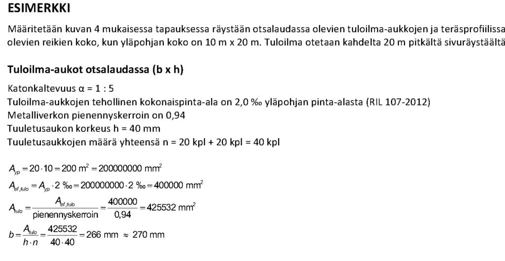 Kyseisessä tapauksessa yhdellä 20 m pitkällä sivuräystäällä otsalaudassa tarvitaan 20 kpl tuloilma-aukkoja 270 mm x 40 mm (1 kpl / ristikkoväli) ja teräsprofiilissa tuloilmareiät d = 30 mm k-jaolla 50 mm.