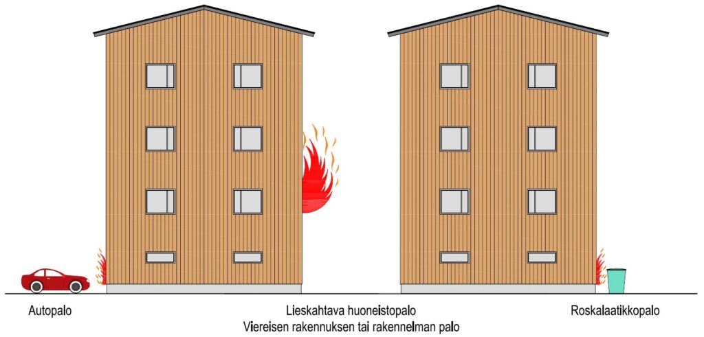 Julkisivupalon saattaa aiheuttaa kuvassa 1 esitetyt tekijät. Huoneistopalon lieskahtamisen aiheuttaman julkisivupalon todennäköisyys sprinklatussa P2-paloluokan rakennuksessa on häviävän pieni, koska sprinklaus estää lieskahtamisen. Alimman kerroksen julkisivu tulee aina olla vähintään B-s2, d0-luokan tarvikkeista tehty, kun kysymyksessä on P2-paloluokan 3…8-kerroksinen asuin- ja työpaikkarakennus. Tällä halutaan estää julkisivun syttymistä alimman kerroksen tasosta (auto- tai roskalaatikkopalo). Sama vaatimus koskee joissakin tapauksissa myös P1-paloluokan rakennusta.