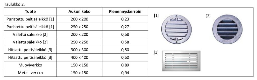Ulkoilmalla tuuletetun yläpohjan tuuletuksen mitoitusohjeita on esitetty taulukossa 1. Yläpohjan pinta-ala lasketaan kuten huoneistoala. Ulkoilmaan rajoittuviin tuuletusaukkoihin voidaan asentaa sinkitty teräsverkko estämään pieneläinten pääsy yläpohjaan. Teräsverkon silmäkoon tulee olla vähintään 4 – 6 mm, koska silmäkooltaan pienempi verkko saattaa tukkeutua ilmassa olevista roskista hyvinkin nopeasti. Tuuletusaukossa olevan verkon tai säleikön vaikutus aukon pinta-alaan huomioidaan pienennyskertoimella, joka saadaan taulukosta 2.