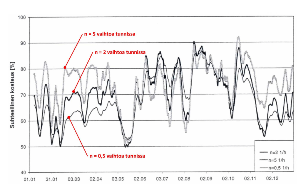 Ryömintätilan tuuletusta ei tule suunnitella liian suureksi, koska talvella liian suuri tuuletus viilentää ryömintätilaa, jolloin sen suhteellinen kosteus nousee (kosteuden tiivistymisriski ryömintätilaan lisääntyy). Ryömintätilan viileneminen viilentää myös lattiaa ja lisää routasuojauksen paksuutta ryömintätilassa. Tutkimuksissa on havaittu, että tuuletuksen lisääminen ei alenna ryömintätilan suhteellista kosteutta merkittävästi. Suhteellisen kosteuden alentamiseksi kosteuden lähteet tulee minimoida. Kuvassa 4 on vertailtu mittausten ja laskentamallin avulla ilmanvaihdon vaikutusta ryömintätilan suhteelliseen kosteuteen.
