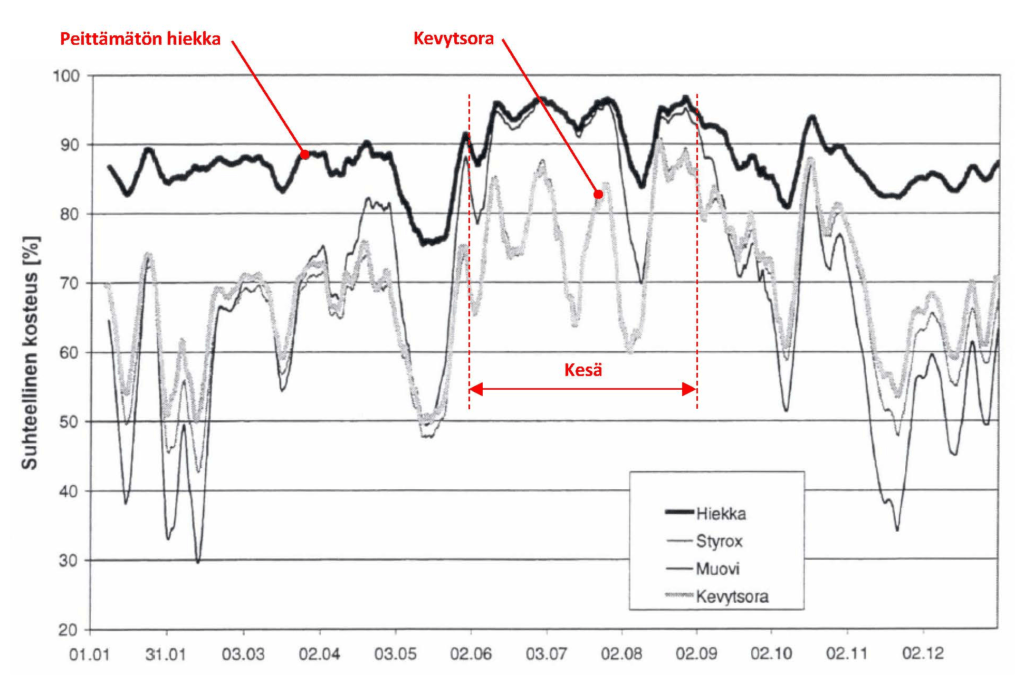 Kuvassa 7 on vertailtu mittausten ja laskentamallin avulla ryömintätilan pohjaratkaisujen vaikutusta ryömintätilan suhteelliseen kosteuteen. Peittämätön maanpinta pitää ryömintätilan suhteellisen kosteuden ympäri vuoden hyvin korkealla. Kevytsora ja polystyreenilevyt laskevat suhteellista kosteutta myös kesällä. Muovikalvo ei laske ryömintätilan suhteellista kosteutta kesällä, koska se ei pysty nostamaan ryömintätilan lämpötilaa. Tällöin talven kylmentämä perusmaa viilentää ryömintätilaa ja ryömintätilaan johdettava lämmin ulkoilma nostaa viileän ryömintätilan suhteellista kosteutta. Kesällä kosteudenlähde on ulkoilma eikä perusmaa, joten ryömintätila tulee saada kesällä mahdollisimman nopeasti lämpimäksi.