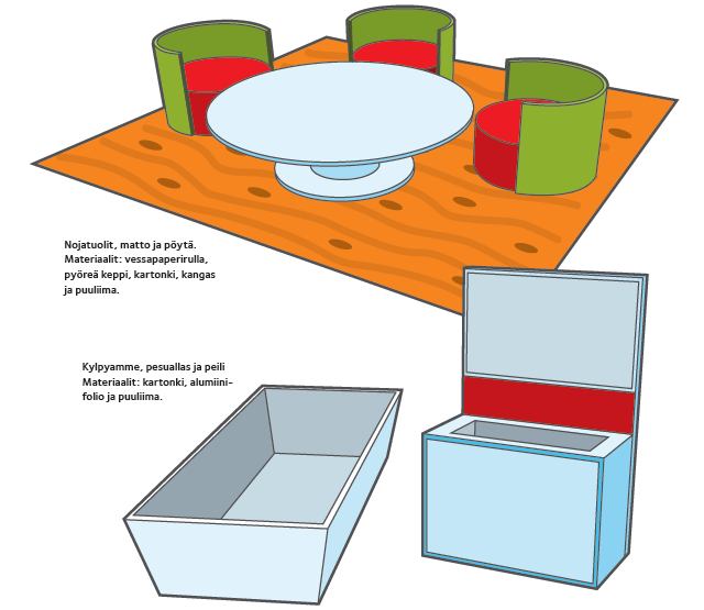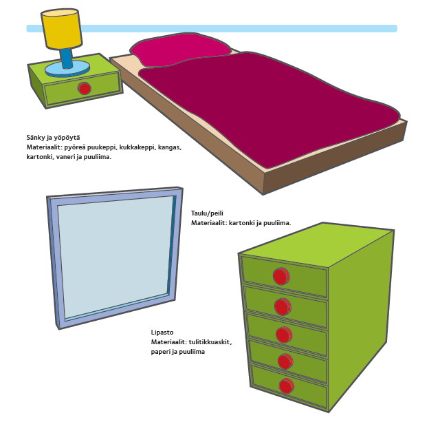 On viimein aika asettua taloksi! Ensin tarvitaan tietysti huonekaluja ja muita varusteita, joita voit helposti rakentaa itse, kun käytät vain vähän mielikuvitusta. Niittaa tulitikkuaskeja toistensa päälle ja saat lipaston. Vessapaperirullista, pienistä laatikoista ja purkeista on apua, kun rakennat tuoleja, pöytiä ja nojatuoleja. Tapetiksi käy lahjapaperi ja mattoja ja verhoja saa kangaspaloista. Muita hyviä välineitä ovat kartonki, alumiinifolio, erikokoiset leivontavuoat, kukkakepit, puuliima, pensselit ja vesiohenteiset maalit.