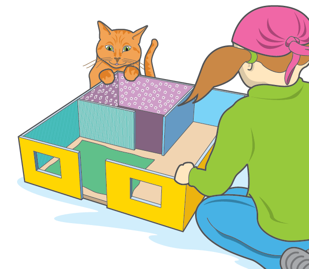 Pitääkö nukkekodilla leikkiä etupuolelta? Voit yhtä hyvin rakentaa talon, josta puuttuu katto ja leikkiä yläpuolelta, kuten kuvassa. Ole kuitenkin tarkkana, ettei joku utelias vieras muuta taloosi – kissa, esimerkiksi. Talon sisustaminen on yhtä hauskaa kuin sen rakentaminen. Voit maalata ja tapetoida huoneita, kutoa pieniä mattoja ja rakentaa omia huonekaluja.