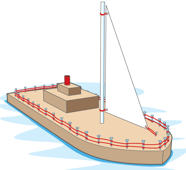 Reelinki laivan reunalle syntyy nauloista, joiden ympärille kieputetaan narua. Lopuksi voit vielä maalata veneen hienoksi, ennen kuin se lasketaan merille.
