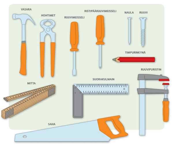 Kuvassa on sellaisia työkaluja, joita puutöissä käytetään ja joiden avulla rakentaminen käy helpommin. Osa näistä teillä on varmasti jo kotona, ja loput voit ostaa tai lainata joltakulta, jolla on laajempi työkalupakki. Työkalujen kanssa täytyy olla tarkkana. Niitä pitää käyttää varovaisesti, sillä vasaralla sormeen lyöminen sattuu ja sahanterä on todella terävä. Pyydäthän siksi aikuisen apua ennen kuin ryhdyt töihin. Mutta katso, ettei hän tee töitäsi puolestasi! Nyt on sinun vuorosi olla puuseppä.