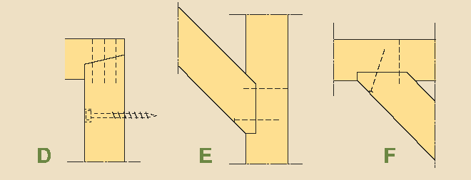 Kattotuolit (11) liitetään ylhäältä liitoslaudoilla (12) , jotka kiinnitetään huolellisesti ruuveilla 4,0 x 60. Käytä 8 + 8 ruuvia kattotuolia kohden. Kun kattotuolin selkäpuihin on tehty vaakasuorat lovet kannattimien leveydelle (45), kiinnitetään kattotuoli paikoilleen metallisilla kulmalevyillä 50 x 50 x 40, jotka kiinnitetään naulauslevyruuveilla. Ulos näkyvien alaosien muoto sahataan sähköisellä vanne- tai pistosahalla.