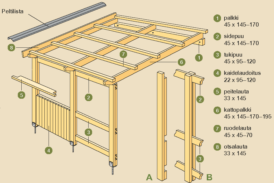 Katoksen lumikuorma jakautuu ruodelaudoituksen välityksellä kattopalkeille (6) ja edelleen takareunan kannattimelle ja etureunan pilarirungolle. Pilariväli on enintään 1000 – 1200 ja ne kiinnitetään pilarikengillä perustuksiin. Etureunan kannatus tehdään pilareihin lovetulla sidepuulla (2) ja palkki (1) tukee takareunaa. Pilarit kiinnitetään ruuveilla kuumasinkittyihin pilarikenkiin esiporattujen reikien läpi. Yläosassa pilarit kiinnitetään sidepuun (2) loviin vähintään neljällä ruuvilla 6,0 x 80 molemmilta puolilta. Alemmas pilarien väliin voidaan tehdä kaide. Sen runkona on kaksi vaakasuoraa tukipuuta (3), jotka kiinnitetään sopiviin kohtiin ruuveilla 6,0 x 80. Tiheä kaide valmistetaan pystysuorista säleistä (4) , jotka kiinnitetään kaiteen tukipuihin lankanauloilla 60 x 2,3. Säleiden alaosat sahataan vinoon, jotta muodostuu tippanokka. Yläpuolelle kiinnitetään peitelauta (5), jonka pyöristetty yläreuna johtaa valuvan veden pois rakenteista. Kattopalkit (6) kiinnitetään pitkillä ruuveilla suoraan pilarien yläpuolelle sidepuuhun (2) kattopalkkien läpi. Takareunastaan kattopalkit kiinnitetään vastaavasti ruuveilla seinärakenteeseen kiinnitettyyn palkkiin (1) tai vaihtoehtoisesti ne voidaan kiinnittää seinärakenteisiin palkkikengillä 45 x 137, jotka kiinnitetään naulauslevyruuveilla. Palkkien kiinnityksen voi vahvistaa metallisilla kulmalevyillä 90 x 90 x 40, jotka kiinnitetään ankkurinauloilla 40 – 4,0 tai ankkuriruuveilla osien (2) ja (6) väliin. Kattopalkkien päälle naulataan ruodelaudat (7) lankanauloilla 75 x 2,8. Jos puutavaran paksuus on yli 32, käytetään lankanauloja 100 x 3,4. Ruodelaudoituksen päälle asennetaan muovi- tai peltikatto valmistajan ohjeiden mukaan.