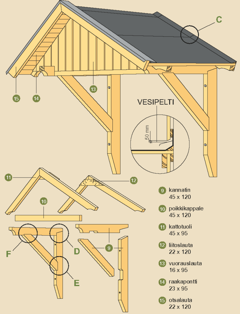 Vesikatteen alusta on (14) on raakaponttilautaa, joka naulataan kattotuoleihin lankanauloilla 75 x 2,8. Se peitetään kattohuovalla, joka taitetaan ylös kolmiolistan päälle otsalautaa ja talon seinää vasten. Otsalauta 15 naulataan kiinni ulos työntyvään kattoon ja kolmiolistaan. Käytä huopanauloja 20 x 2,5. Peitä otsalaudan yläreuna tehdasvalmisteisella peltilistalla joka kiinnitetään otsalaudan ulkoreunaan kateruuveilla 30 – 2,5.