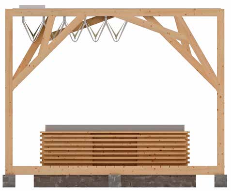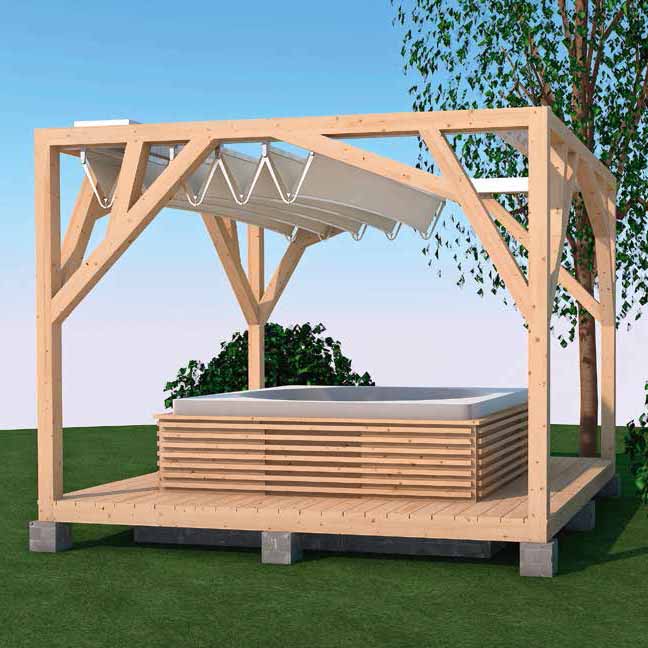 - Tee kesähuoneelle perustukset esimerkiksi kevytsorapilariharkoista. Asenna pilareihin valmiiksi teräksiset pilarikengät, joihin puurunko kiinnitetään. Asenna pilareiden ympärille routasuojaus maan alle. Poista kasvusto lattian alta ja vaihda pintamaa sepeliksi. Jacuzzi perustetaan valmistajan ohjeiden mukaan.