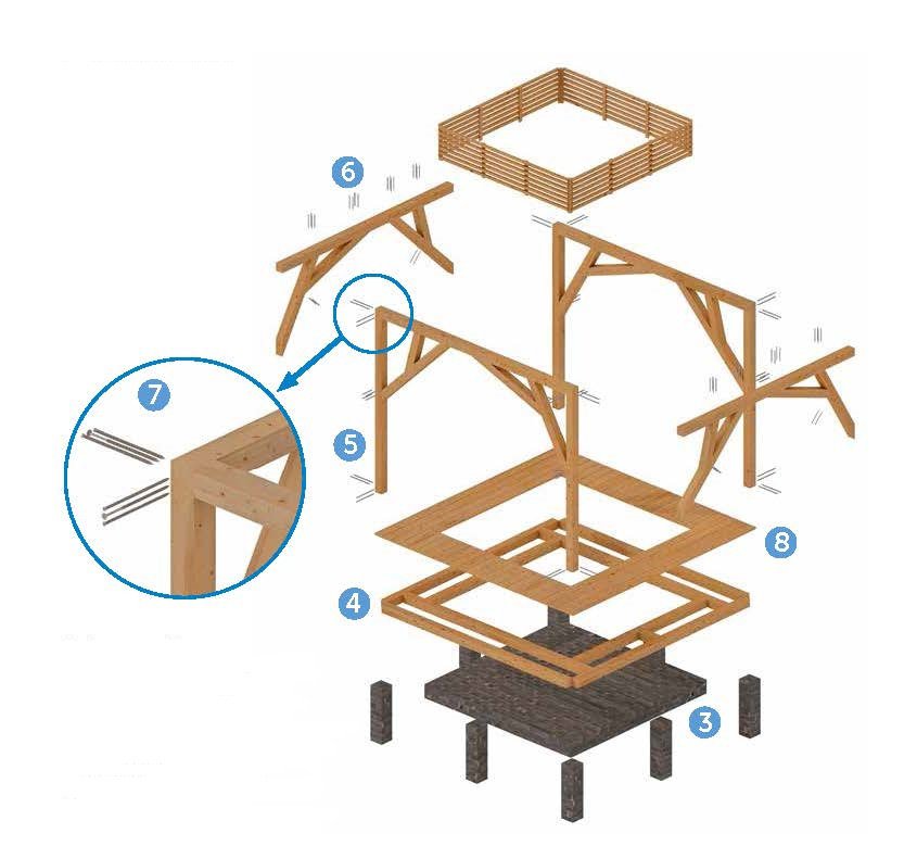 - Kokoa sen jälkeen kesähuoneen sivuseinämät valmiiksi vaakatasossa lattian rungon päällä. Nosta sivut paikoilleen, tue ne väliaikaisin tuennoin oikeaan asentoon ja kiinnitä perustuksiin ja lattian runkoon.