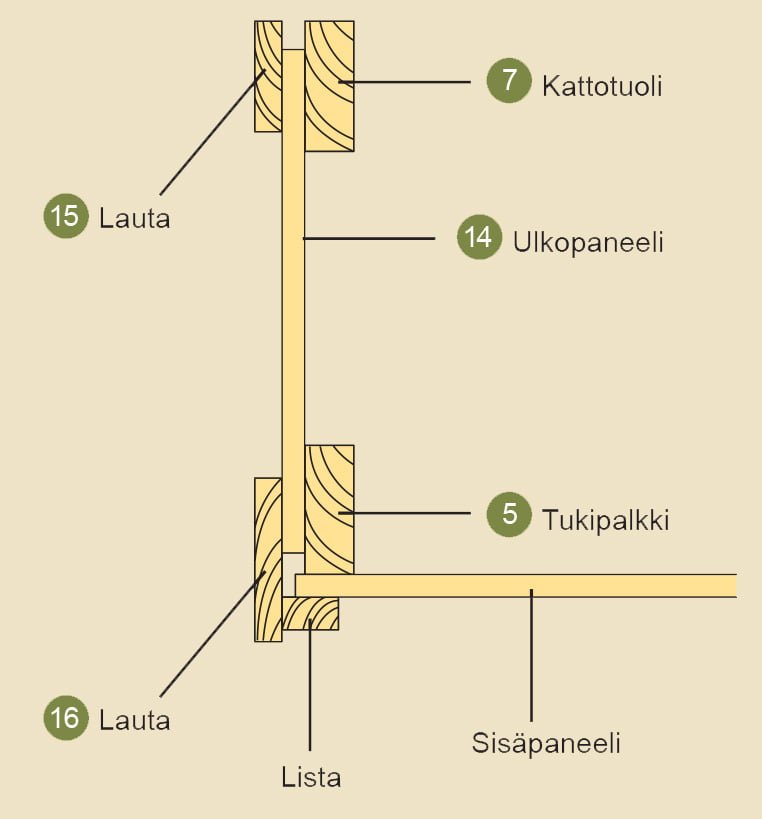 Ulommaisten kattoparrujen ulkosivulle naulataan kaksi lautaa (17). Ylempi peittää kattopaarteiden välin ja alempi peittää sisäkaton päätypuut. Jätä ponttilaudoituksen alle noin 25 mm kokoinen tuuletusaukko (18). Taaimmaisen päätyseinän voi tiivistää laudalla. Raot kannattaa suojata hyönteisverkolla, joka niitataan kiinni.