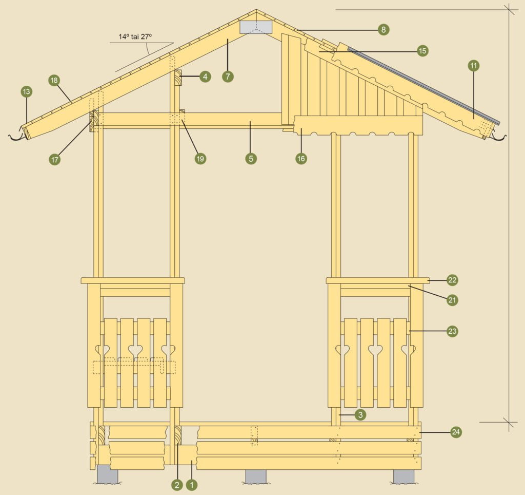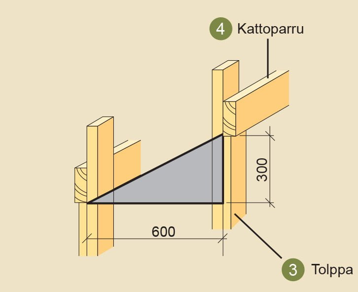 Tolppiin (3) rakennetaan ”hyllyt”, joihin kattoparrut (4) asetetaan. Tarkista osien korkeudet sovittamalla osia yhteen. Kulmatolppien tulee ulottua samalle tasolle, 2300 lattiapalkkien yläpuolelle. Keskimmäisten tolppien tulee ulottua 300 korkeammalle, kun katon kaltevuus on 27° ja 1540 jos katon kaltevuus on 14°. Kattoparrujen tulee ulottua 45 mm etummaisen tolpan etupuolelle. Tarkista tolppien väliset etäisyydet ennen naulaamista.