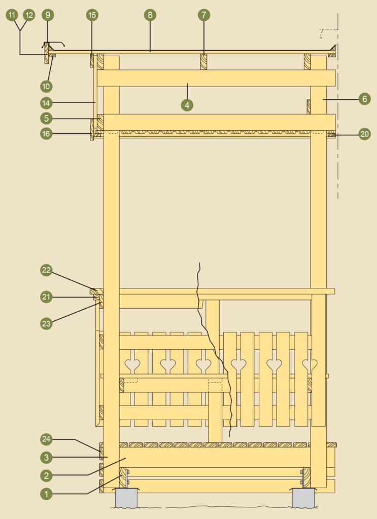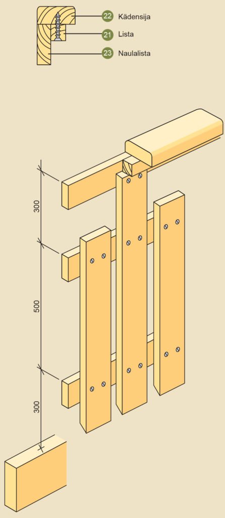 Naulaa kolme poikkipalkkia (21) kiinni tolppiin: niihin kiinnitetään kaidesäleet, jotka sahataan alapäädyistään vinoiksi veden poisvalumisen helpottamiseksi. Merkitse sälelautojen sijainnit tasaisesti palkkeihin ja ruuvaa laudat kiinni. Kädensijassa (22) on pyöristetyt yläkulmat. Pyöristä ja puhdista kaikki päätyjen kulmat.