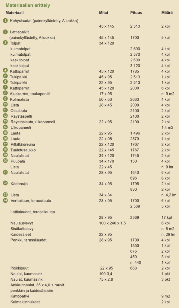Ohjeessa esitetyt mitat ovat millimetreinä, ellei toisin mainita. Mitat ovat esimerkkejä, voit hyvin vaihtaa ne saatavilla olevaan puutavaraan. Käytä kantavissa rakenteissa vain ruostumattomasta teräksestä tehtyjä kiinnikkeitä. Kansilautojen kiinnitykseen voi käyttää kuumasinkittyjä ruuveja.