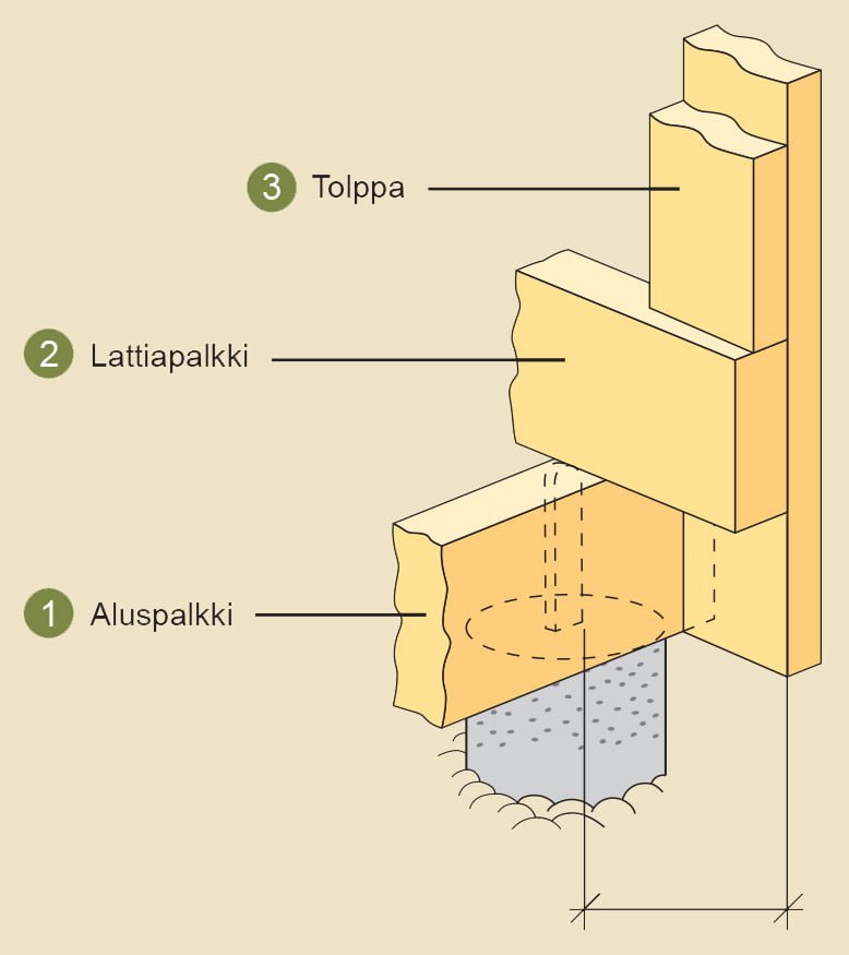 Laita valmiiden pilareiden päälle kosteuseristeeksi bitumikermikaistale ja asenna sen päälle lattian aluspalkit (1). Tarkista, että palkkien väliset etäisyydet ovat yhtä suuret, että palkkien päät ovat suorassa linjassa ja että ulommaisten palkkien päätyjen ristimitta on sama molempiin suuntiin. Kiinnitä palkit peruspilareiden laattateräksiin 50 mm pitkillä puuruuveilla.