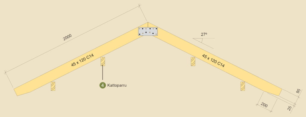 Kattotuoli (7) koostuu paarteista, jotka nojaavat kattoparruihin. Leikkaa katonharjan liitoskohta 27° kulmaan. Kattotuolin alapäät huolitellaan sahaamalla niistä pois kiilat, n. 25 x 200.