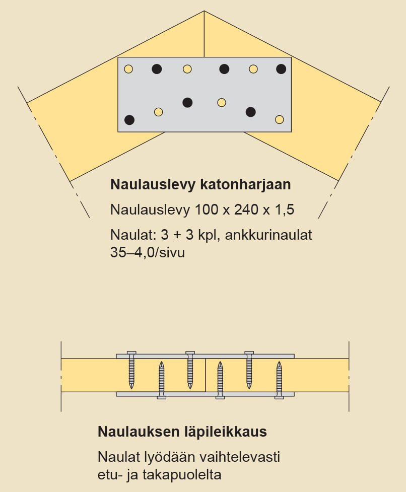 Liitä paarteet harjalta yhteen kahden naulauslevyn avulla (koko 100 x 240 x 1,5), yksi kummallekin puolelle. Käytä ankkurinauloja tai -ruuveja (koko 35 x 4,0), vähintään 6 kappaletta kumpaankin levyyn. Asettele naulat tai ruuvit mallikuvan G mukaisesti.