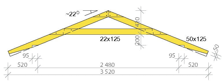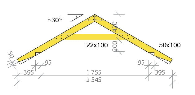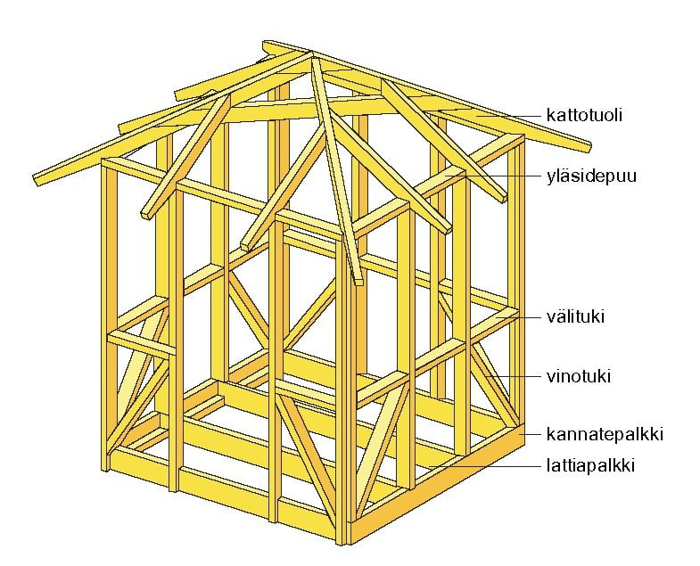 - Päätyseinien runkotolppien alapäät lovetaan lattiapalkkeihin sopiviksi ja yläpäät katkaistaan ja lovetaan kattotuoleihin sopiviksi. Tolpat naulataan paikoilleen samalla tarkistaen, että ne tulevat pystysuoraan. Naulakoko on 100 x 3,4.