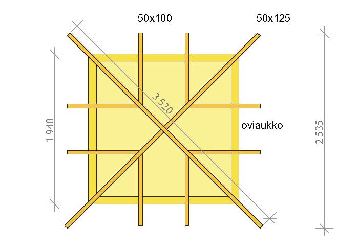 - Lattiapalkkien molemmat päät lovetaan tukirimaan sopiviksi. Lattiapalkit asennetaan paikoilleen vinonaulaamalla ne molemmin puolin kannatepalkkeihin. Naulakoko 100 x 3,4.