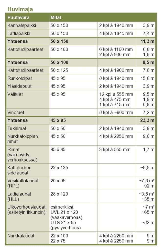Alla olevat luettelot sisältävät piirustuksissa esitettyjen rakennusten puutavaran mitat ja määrät ilman hukkapaloja. Huvimajan rakenteelliset yksityiskohdat tehdään leikkimökin vastaavista kohdista tehtyjä detaljipiirroksia noudattaen. Alla olevat luettelot sisältävät piirustuksissa esitettyjen rakennusten puutavaran mitat ja määrät ilman hukkapaloja. Huvimajan rakenteelliset yksityiskohdat tehdään leikkimökin vastaavista kohdista tehtyjä detaljipiirroksia noudattaen. Lisäksi tarvitaan ovet, ikkunat, listoja ja vuorilautoja, mahdolliset kalusteet ja porrasaskelma, nauloja (tai ruuveja), teräskiinnikkeitä, perustukset, kate ja mahdolliset pintakäsittelyaineet, yms.