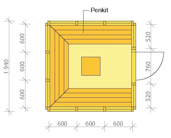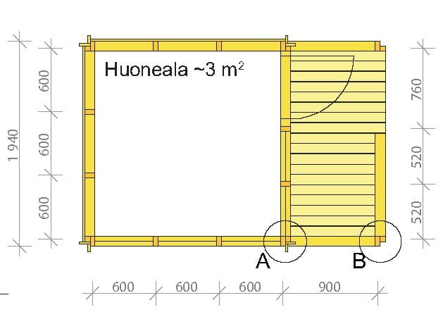 - Mahdolliset kaiteet tehdään detaljipiirrosten mukaan. Sisäänkäynnin kohta varustetaan (kesto) puusta tehdyllä porrasaskelmalla. Laattateräksestä taivutettujen kiinnikkeiden avulla voidaan asentaa mahdollinen viiritanko sisääntulopäätyyn. Tangoiksi soveltuu noin Ø30 mm mäntytanko jonka pituus on 2…2,5 m.