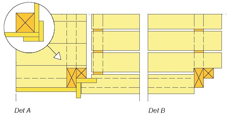 - Nurkkatolpat tehdään detaljipiirroksen A mukaan joko yhdistämällä kaksi tolppaa tai yhdestä paksummasta tolpasta. Nurkkatolpat ja sivuseinien runkotolpat asennetaan paikoilleen vinonaulaamalla ne molemmin puolin kannate- ja lattiapalkkeihin. Naulakoko 100 x 3,4. Vesivaa’an avulla tarkistetaan, että runkotolpat ovat pystysuorassa. Sivuseinien runko tuetaan väliaikaisesti vinolaudoin.