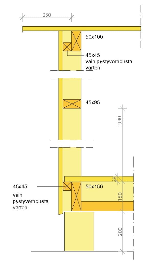 - Päätyseinien runkotolppien väliin asennetaan välituet samalle korkeudelle kuin sivuseinissä, myös yläsidepuun korkeudelle. Mikäli ulkoverhous tehdään pystylaudoituksena kiinnitetään lisäksi 45 mm x 45 mm rimat sekä reunimmaisten lattiapalkkien että kattotuolien ulkokylkeen. Ks. pystyleikkaus, pääty.