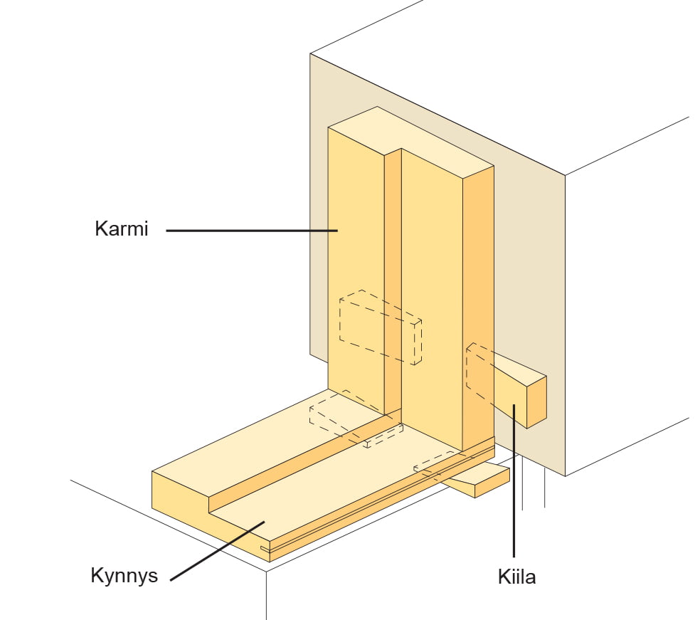 - Oven kynnys peitetään ulkopuolelta kynnyspellillä, joka suojaa kynnyksen alla olevaa tilkettä kosteudelta. Yleensä kynnyksen etupuolella on sahattu tai koverrettu kolo kynnyspellin kiinnitystä varten.