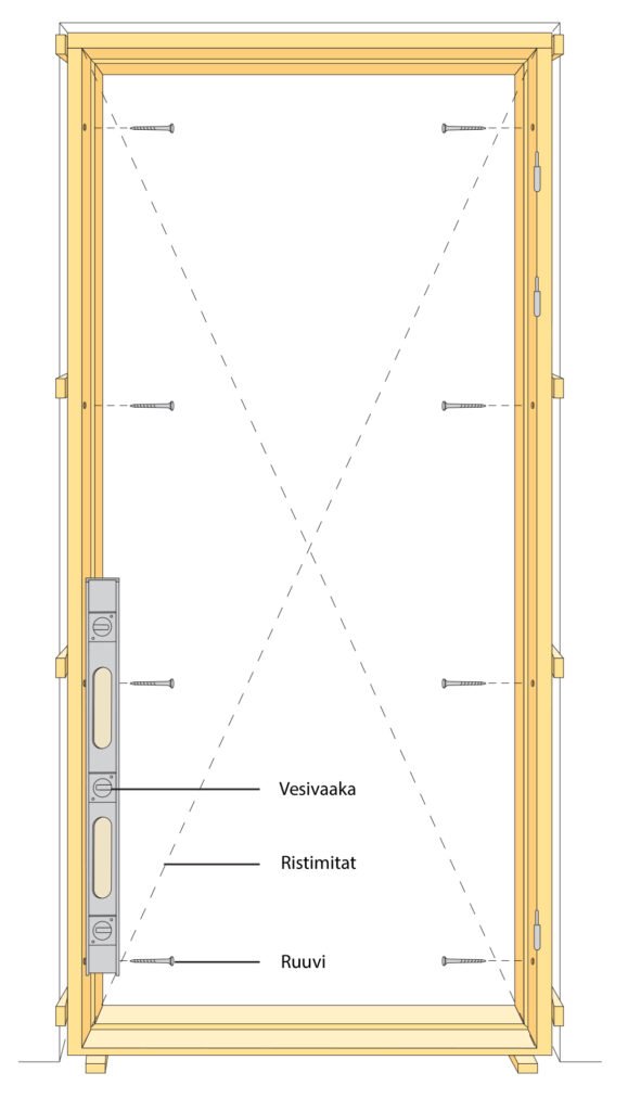 - Mittaa myös karmien väliset ristimitat. On tärkeää, että ristimitat ovat täsmälleen samat. Tarvittaessa voit säätää karmeja kiilojen tai karmihylsyjen ja ruuvien avulla.