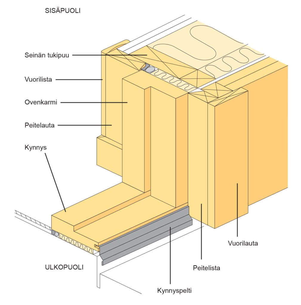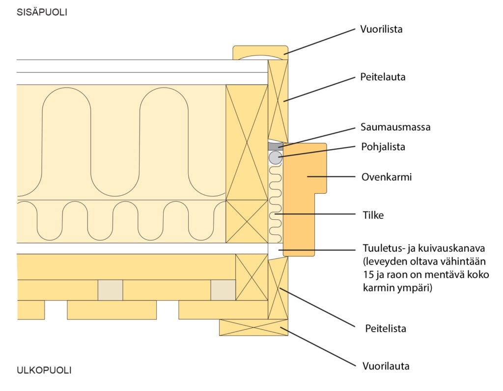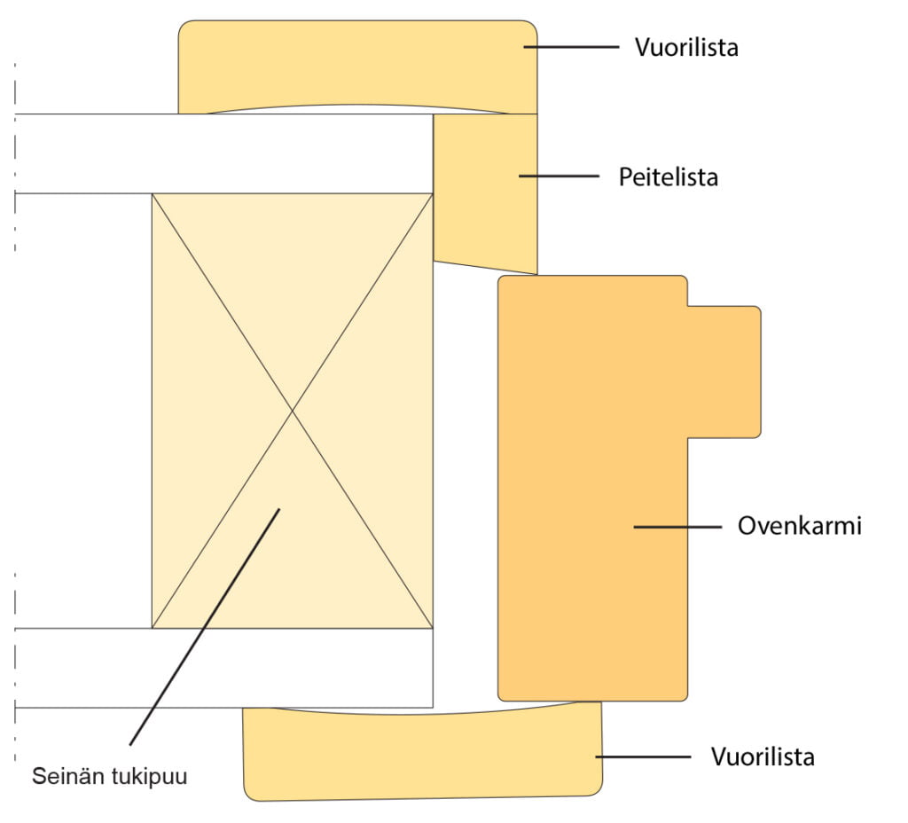 - Tilkitsemisen jälkeen asennetaan puiset peitelistat ja peitelaudatseinään karmia ja oviaukon reunoja vasten. Viimeisenä asennetaan vuorilistat ja vuorilaudat oviaukon ympärille seinän sisä- ja ulkopuolelle.