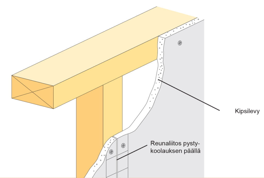 Leikattu suora reuna asetetaan ja sovitetaan kattoa ja seinää vasten. Levyt leikataan 10 – 15 mm huoneen korkeutta lyhyemmiksi. Aseta kipsilevy aluspuuta vasten ja työnnä levy sitten pystyyn kattoa kohden puuriman avulla. Paina levy tukirakenteita vasten, jotta se asettuu kunnolla paikoilleen. Levyssä ei saa olla liitoksia samalla kohdalla ovi- ja ikkuna-aukkojen reunojen kanssa. Sen sijaan levy on sovitettava niin, että liitos tulee aina aukon yläpuolelle.