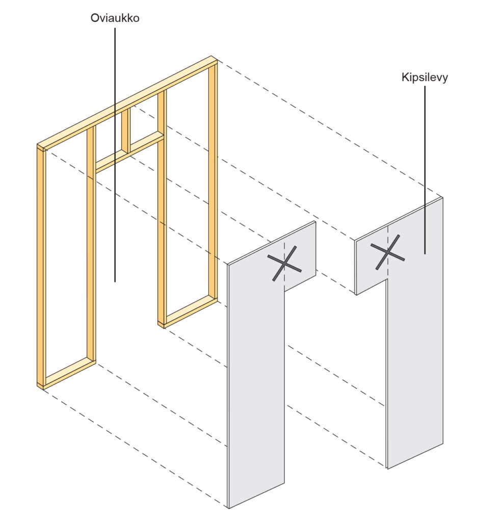 Oviaukon molemmin puolin asennetaan koolaukset. Oviaukon pysty- ja vaakamittojen on oltava noin 10 – 20 mm ovenkarmin ulkomittoja suuremmat. Oviaukon yläpuolelle asennetaan vaakapuu. Oven yläpuolelle tulevaan levyverhoukseen ei saa tehdä jatkoksia oviaukon sivukoolausten kohdalle, sillä silloin voi syntyä halkeamia. Siksi oviaukon yläpuolisen vaakapuun ja kattopuun väliin täytyy asentaa pystysuora koolaus.