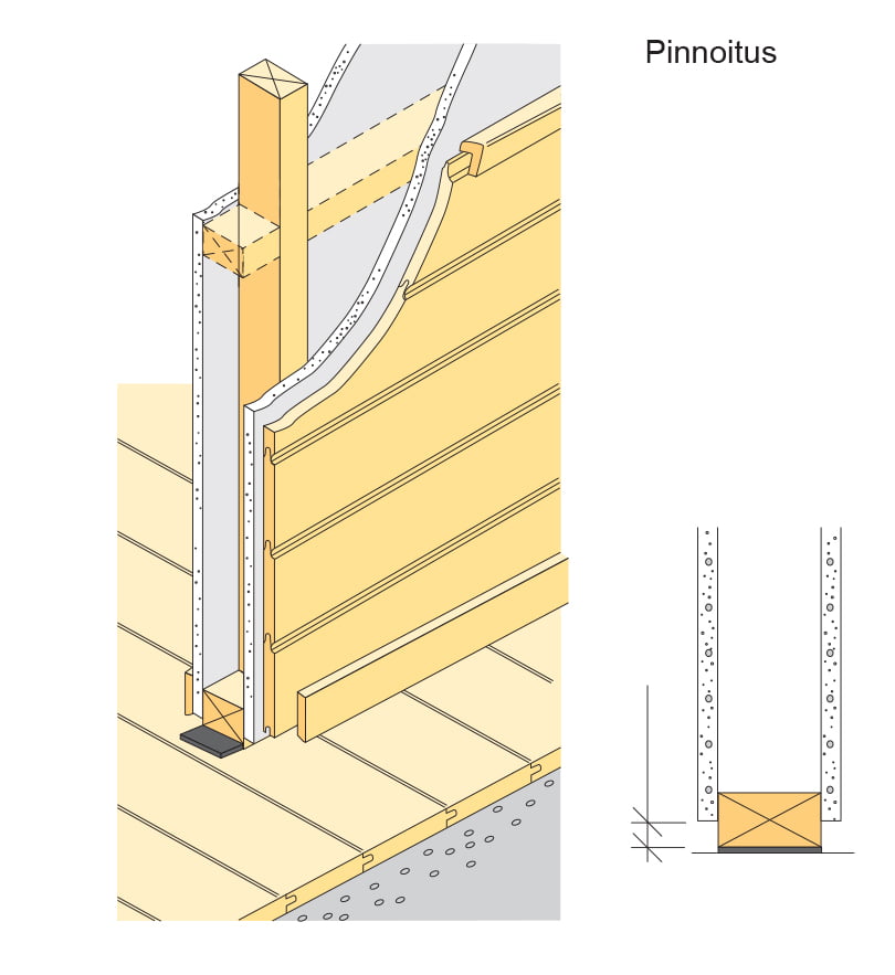 Aloita rakentamalla seinän runko. Runko koostuu koolauspuista, joiden mitat ovat 39 x 66 (kertopuu) tai vaihtoehtoisesti 42 x 66 (liimapuu).