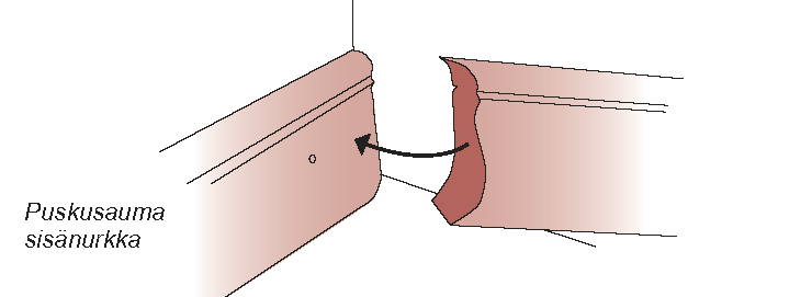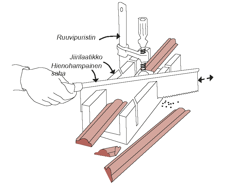 Jalka- ja kattolistojen sisäkulmissa voidaan käyttää puskusaumaa. Toinen lista viedään nurkkaan asti ja toinen pää sovitetaan veistämällä. Käytä puukkoa kehosta poispäin ja pidä käsinettä siinä kädessä, joka pitelee listaa.
