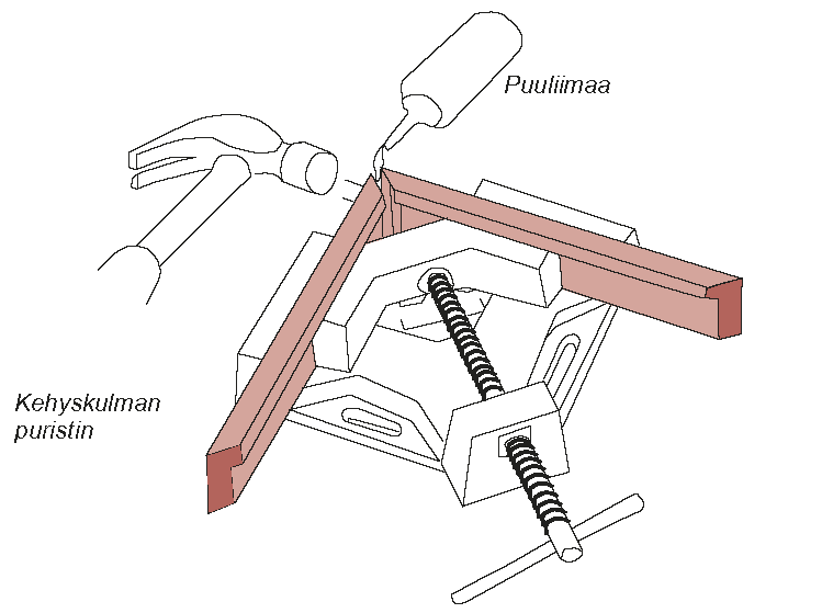 Kulmapuristin on hyvä apuväline taulukehysten valmistukseen. Kun kehyksen sivut on sahattu jiiriin, voidaan kulma kerrallaan tukea liimausta ja naulausta varten. Työn helpottamiseksi voidaan puristin ruuvata kiinni työpenkkiin. HUOM! Ota huomioon, että mittaus pitää tehdä kehyssivujen sisäreunasta kehysuran niistä sivuista, joihin taulun reunat sovitetaan.