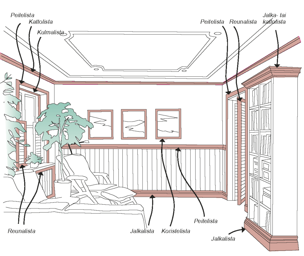 Kuvassa näytetään, miten joitakin listoja voidaan käyttää huoneessa. Jalkalista peittää lattia- ja seinämateriaalien välisen raon. Sitä on käytetty myös kirjahyllyn sokkelina. Peitelista on puolipaneelin yläreunassa. Listoja voi käyttää esim. taulujen kehyksissä ja patterin suojuksessa. Kulmalista peittää reunoja ikkunasyvennyksessä. Peitelistaa käytetään ikkuna- ja oviaukkojen ympärillä. Kattolista tai varjolista peittää seinän ja katon välisen raon.
