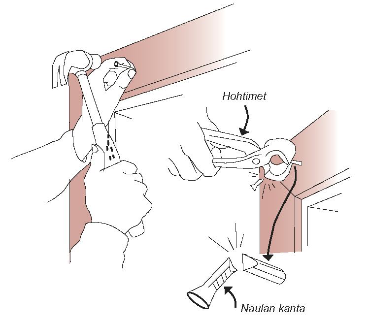 Hohtimia käytetään myös käyristyneiden naulojen poisvetämiseen. Muista aina käyttää puukappaletta suojana, ettei listaan tule painaumajälkiä.