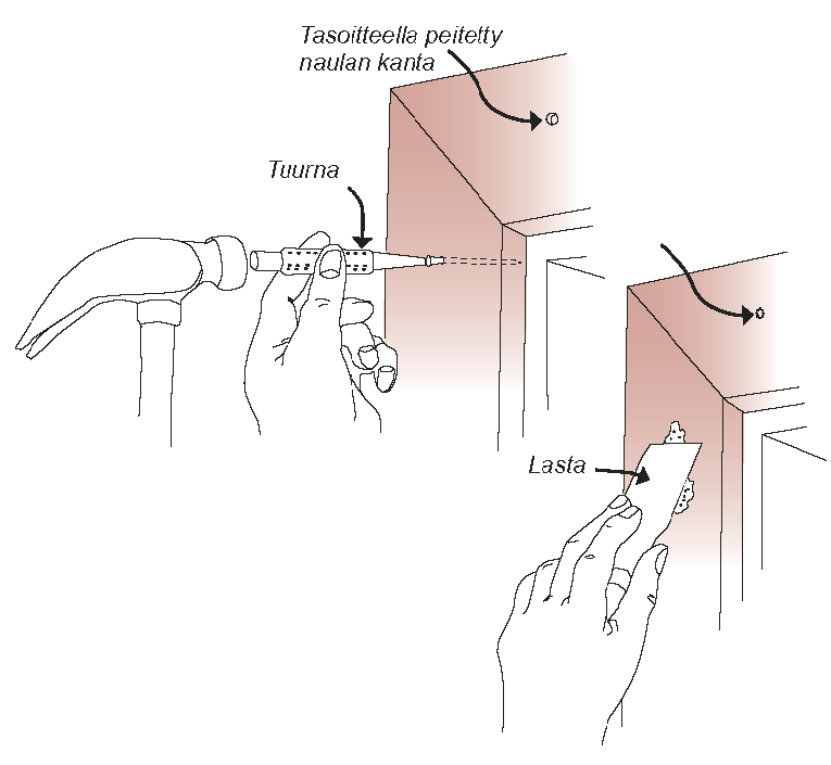 Uppokantanaulauksessa lyö naulaa vasaralla, kunnes 2-3 mm on lyömättä. Lyö loppuosuus ja upota naulankanta puuhun käyttämällä tuurnaa. Käytä lähellä listan päätyä aina esiporausta halkeamien välttämiseksi.