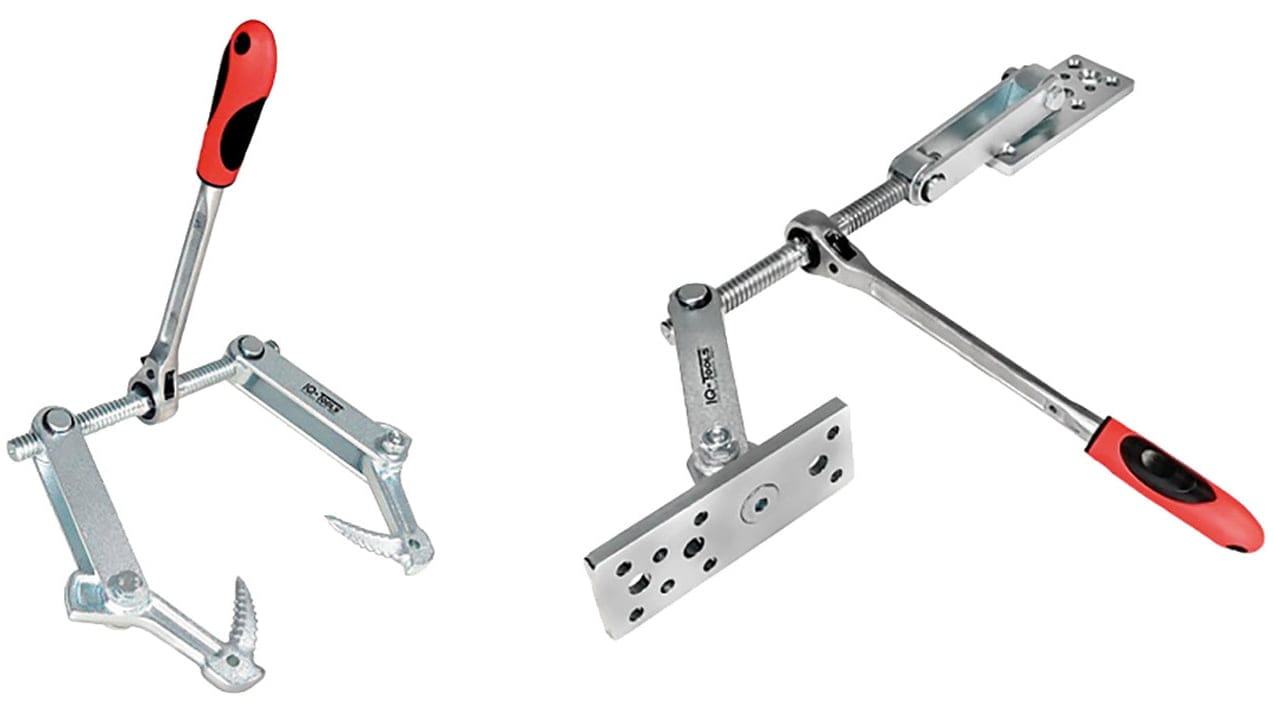 Elementtikiristimessä on vapaasti pyörivät tartuntalevyt, jotka kiinnitetään elementteihin 8 tai 12 mm:n ruuveilla. Ruuvikiristin soveltuu erityisen hyvin massiivipuisten elementtien saumojen kiristämiseen ahtaissa kulmissa.