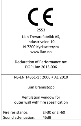 Lian Brannstopp-tuuletusluukku paloluokituksen vaativiin seinärakenteisiin.