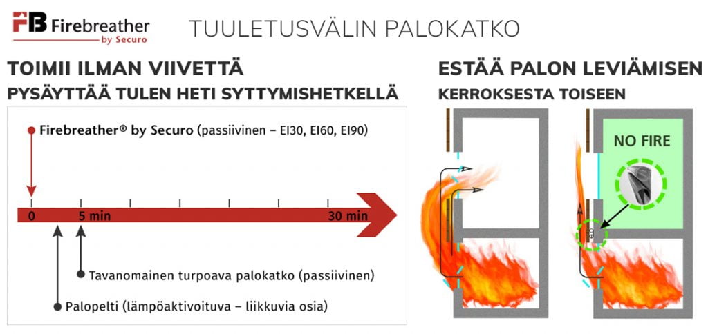 Paloluokitellut Firebreather-palokatkot, pysäyttävät tulen etenemisen heti, palon syttymishetkellä. Firebreather on markkinoiden ainoa palokatko, joka toimii ilman viivettä. Firebreather pitää tuuletusvälin avoimena, mutta palon sattuessa sulkee sen tiiviisti. Firebreather palokatkot toimivat passiivisesti: niissä ei ole liikkuvia osia, tunnistimia eikä johtoja, eikä ne vaadi erityistä ylläpitohuoltoa.